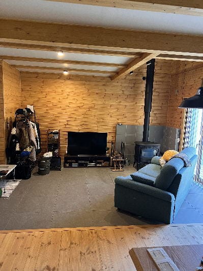 土間リビングに薪ストーブを備えたモダンな築浅美邸!
