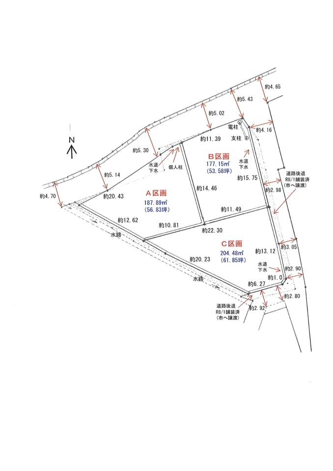 | 備考 | ■地目⇒宅地■地積⇒登記簿上(実測済)■水道⇒新規引込管(PP20)■下水道⇒新規に取付マス設置■防災関係⇒浸水想定区域内(土砂法・液状化は該当無)■立地適正化計画⇒居住誘導地域■電柱支柱の有無⇒B区画の北東角に電柱・支柱各1あり■固定資産税等負担金⇒有(引渡時日割)■L型擁壁あり(南側の擁壁はB所有)■帯コン(東側市道沿いはB所有)■東と南側市道は後退済(R8/1月に舗装済)■学区⇒小井川小学校・東部中学校(東側道向いは長地小学区域)■建基法22・準防火地域など該当しない |