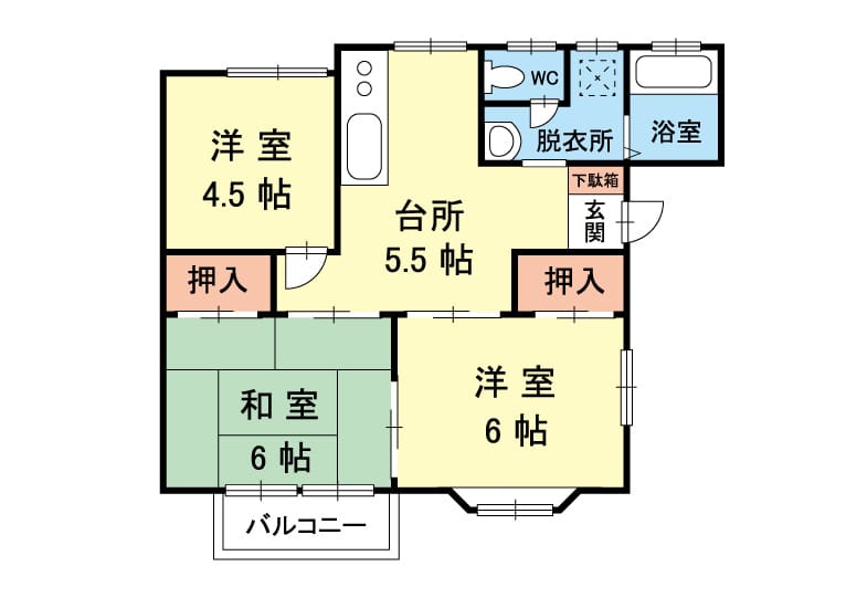 | 間取 | 3DK(和6・洋6・和4.5・DK5.5・洗面所・トイレ・浴室・バルコニー無し) |