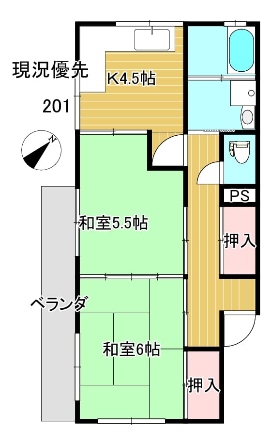 | 間取 | 2SDK(和6 5.5 K4.5 洗面室 風呂 トイレ 収納 バルコニー) |