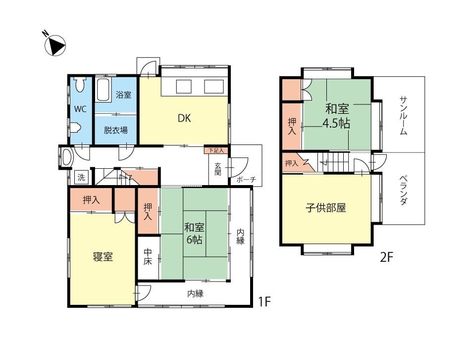 - 間取4DK(和室6帖溶質6帖DK・バス・トイレ二階和室4.5帖・溶質6帖・サンルーム・バルコニー)