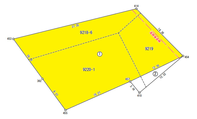 | 接道状況 | 方角:西 道路幅員:5.7m 公私区分:公道 接面:19.07m 方角:東 道路幅員:2.2m 公私区分:公道 接面:14.36m |