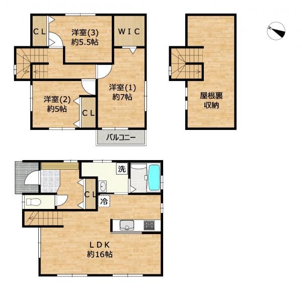 | 間取 | 3SLDK(LDK16帖、洋室7帖・5.5帖・5帖、屋根裏収納) |